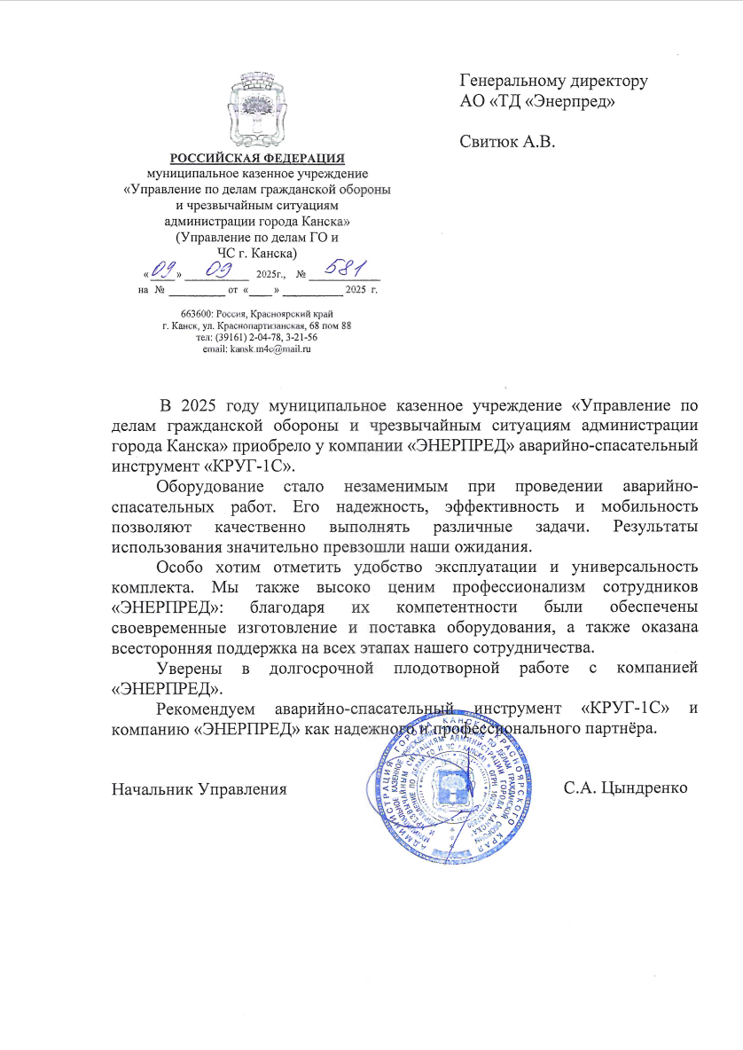 В 2025 году Муниципальное казенное учреждение «Управление по делам гражданской обороны и чрезвычайным ситуациям администрации города Канска» приобрело у компании «ЭНЕРПРЕД» аварийно-спасательный инструмент «КРУГ-1С».