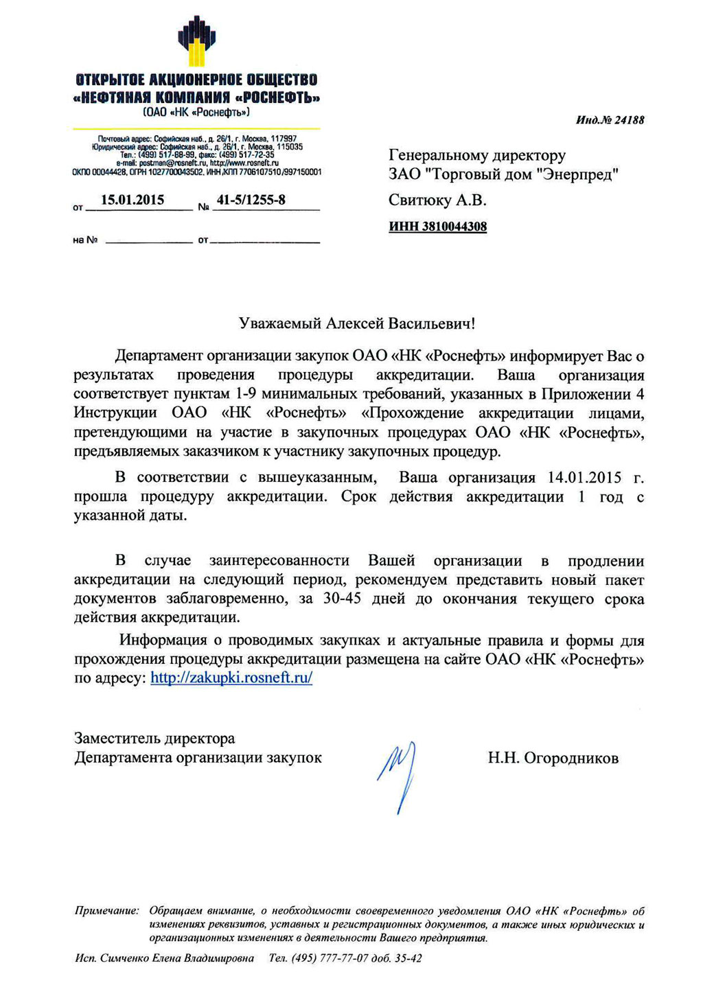 January 15, 2015 JSC "TD" Enerpred "has undergone voluntary accreditation (assessment of the financial and economic status of potential suppliers) in OAO" NK "Rosneft". As a result, our organization is recognized as a competent supplier, complying with all requirements for the participants of procurement procedures requirements.
