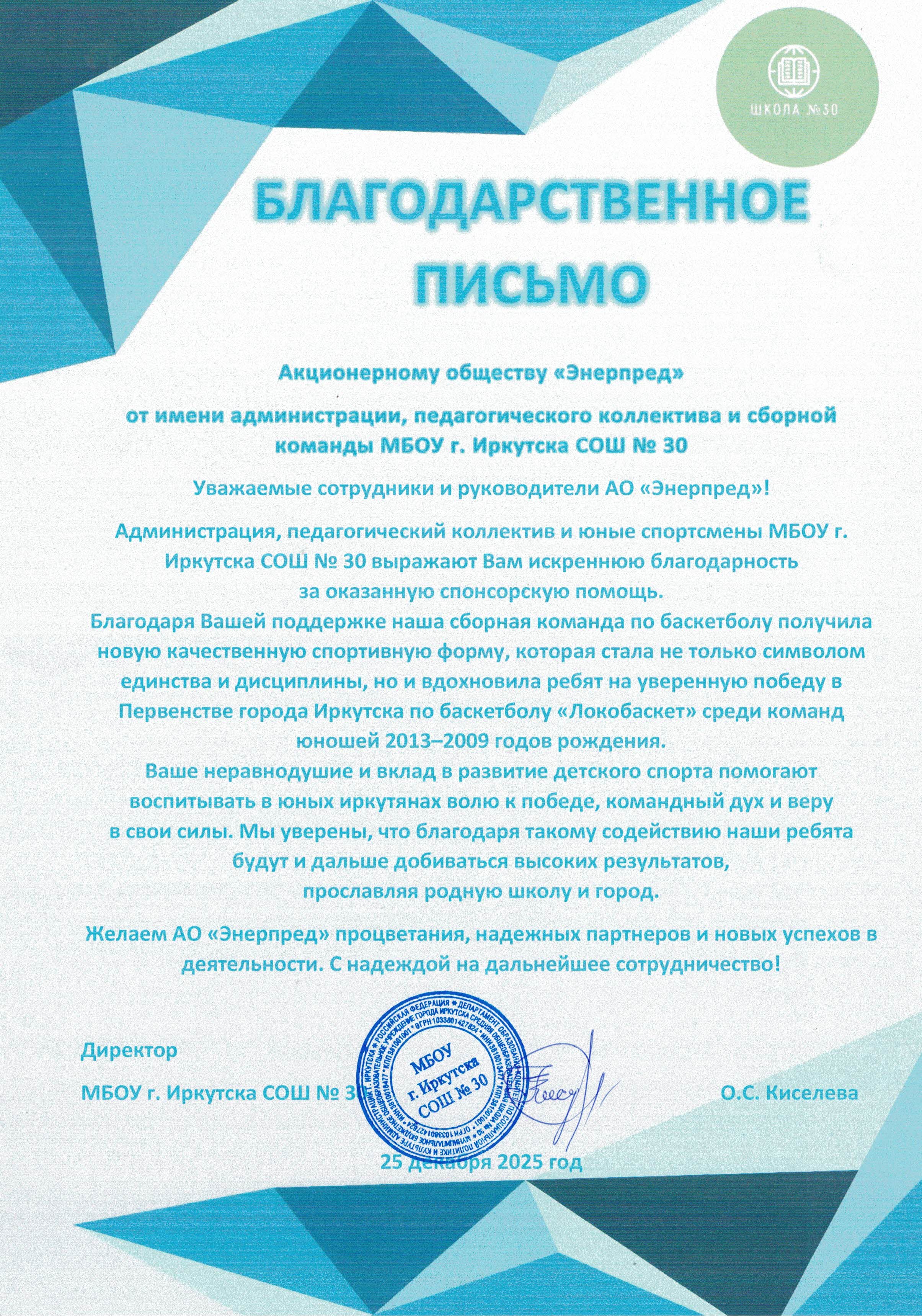 22 декабря 2025 года в Иркутске состоялось торжественное награждение сборной команды МБОУ г. Иркутска СОШ № 30. Юные баскетболисты одержали уверенную победу в Первенстве города по баскетболу «Локобаскет» среди юношей 2009-2013 годов рождения, не оставив шансов соперникам и подтвердив звание сильнейшей команды города.